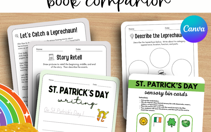 If you are looking for a How to Catch a Leprechaun printable companion, check out these free and editable activities, writing prompts, and flashcards to help your students improve their speech and language skills. The activities are available for free in Canva and require simple materials like green pipe cleaners, shamrocks, and pots of gold. Check out all the free printables today!