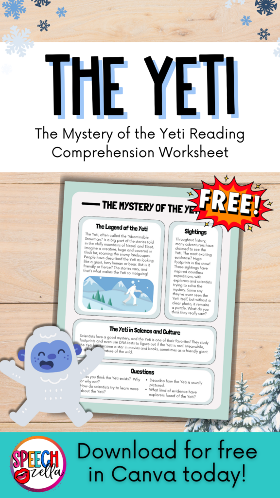 Why are yetis a great way to improve speech and language skills? Most kids are familiar with yetis, and so they’re more willing to describe, explain, infer, and predict what will happen. This is especially helpful for students working on expressive language and narrative skills during therapy sessions.